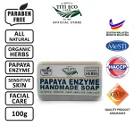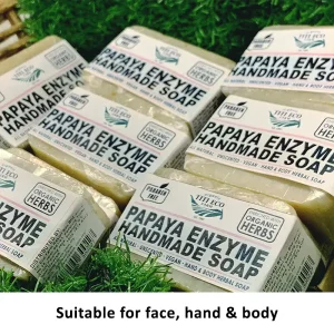 Our Papaya Enzyme Handmade Soap is crafted from natural ingredients, enriched with organic herbs, and free from harsh chemicals. Gentle yet effective, it brings together the cleansing power of coconut oil with the renewing qualities of papaya enzymes.At the heart of this soap is papain, a natural enzyme from papaya that breaks down proteins. Papain gently exfoliates dead skin cells, helping to clear clogged pores, even out skin tone, and promote brighter, smoother skin. Regular use helps reduce acne and encourages skin renewal, leaving behind a refreshed and youthful appearance.